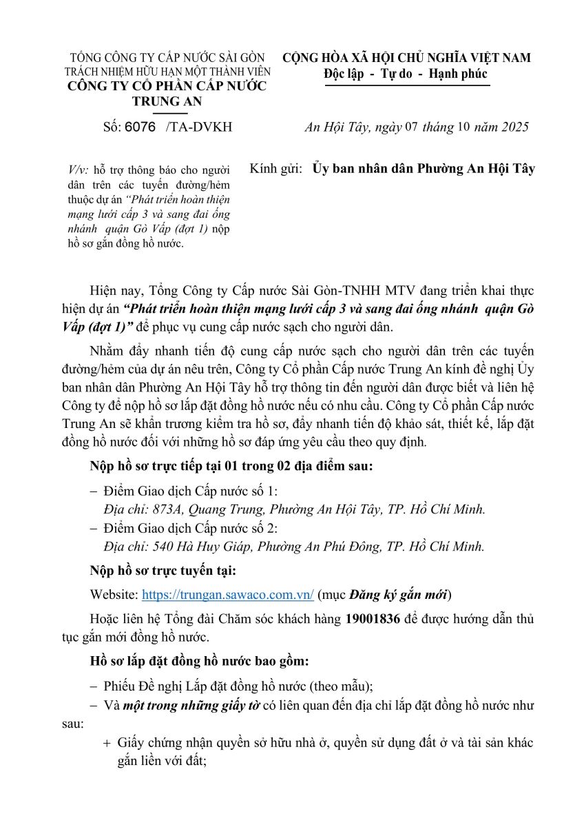 - Thông báo gửi các hộ dân có nhu cầu gắn đồng hồ nước trên địa bàn phường An Hội Tây