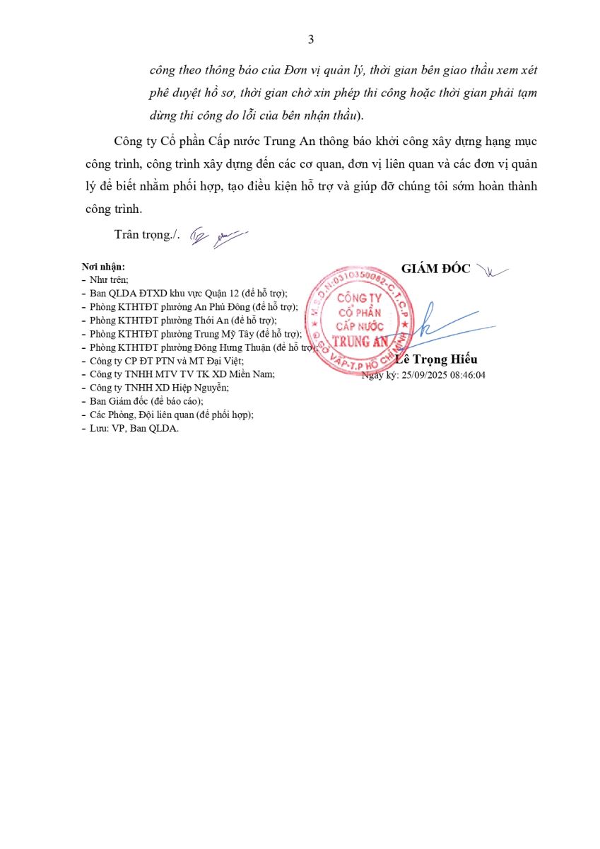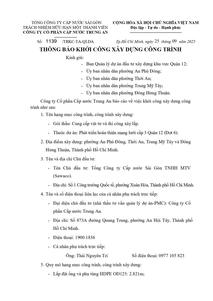 - Thông báo về việc gián đoạn cung cấp nước: ngày 09/9/2025 và ngày 10/9/2025 - Phường Trung Mỹ Tây, Phường Hạnh Thông, Phường An Nhơn, Phường Tân Thới HIệp