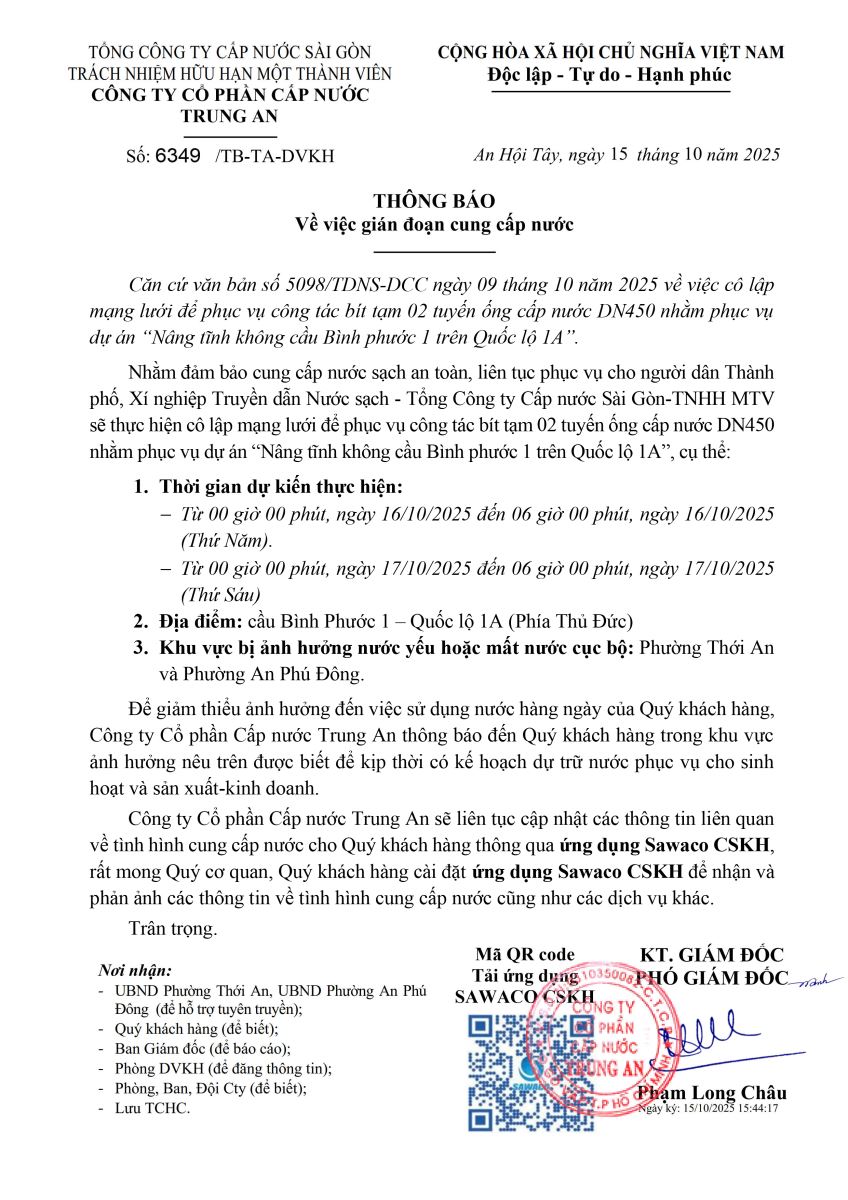 - thông báo về việc gián đoạn cung cấp nước từ ngày 16/10/2025 đến ngày 17/10/2025