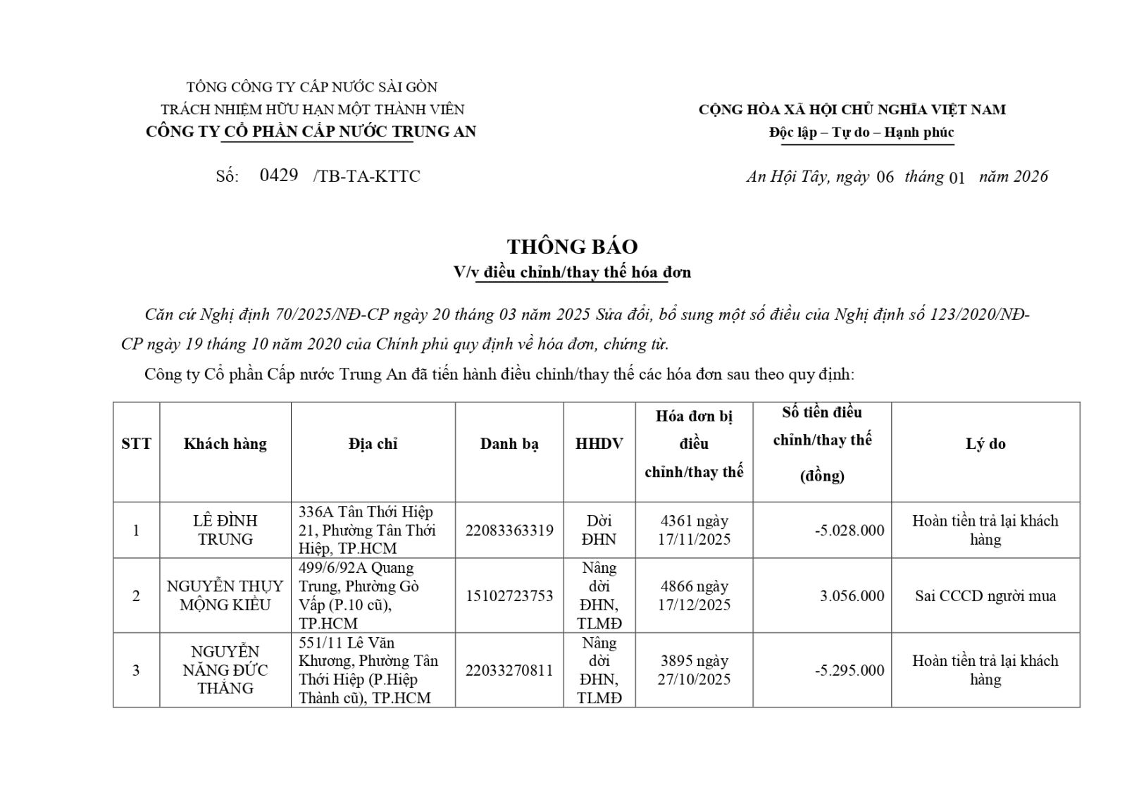 - Thông báo điều chỉnh/thay thế hóa đơn