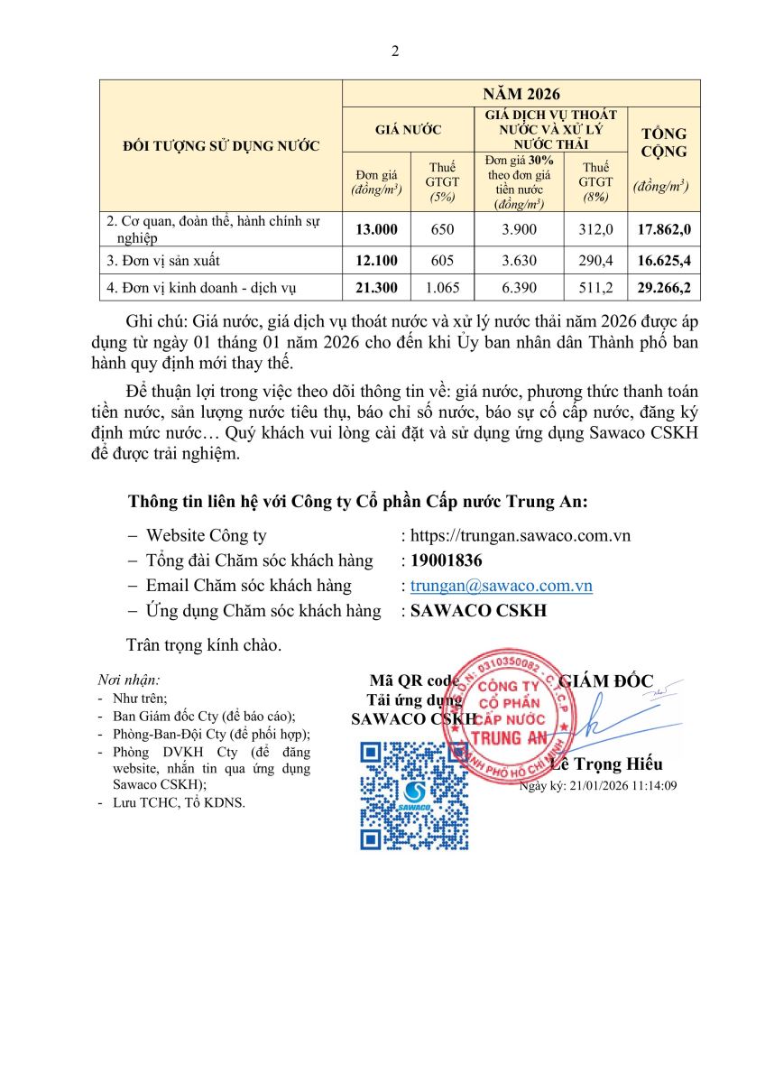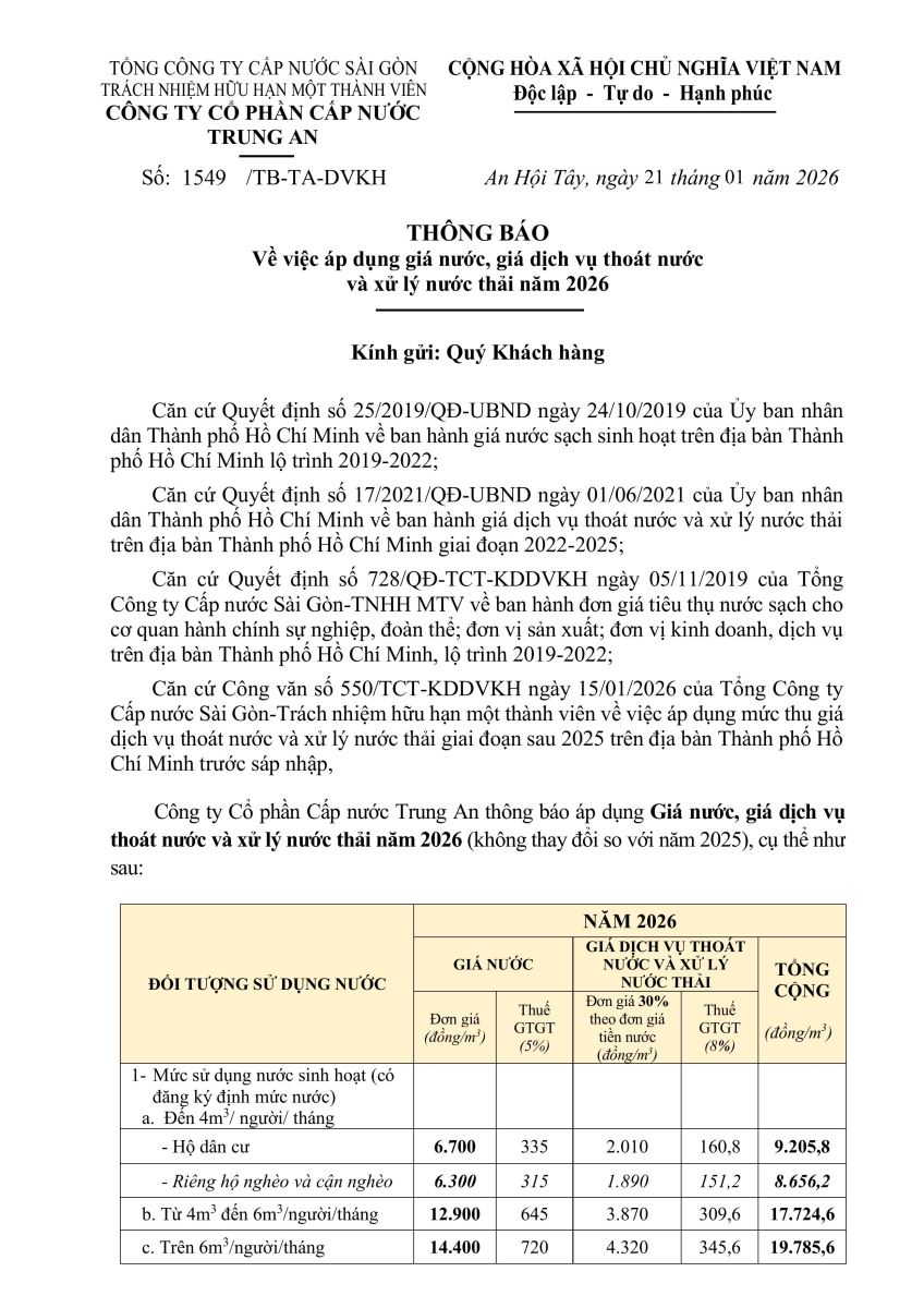 - Thông báo Giá nước năm 2026