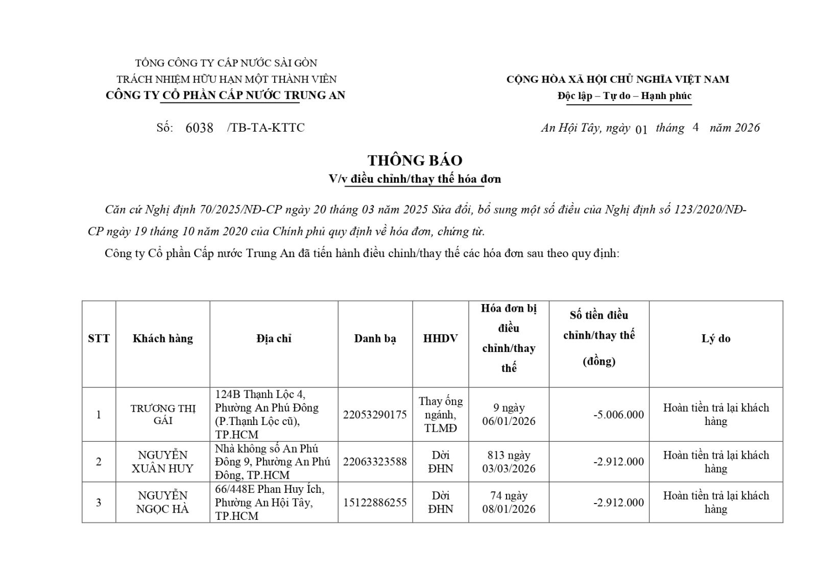 - Thông báo điều chỉnh/thay thế hóa đơn